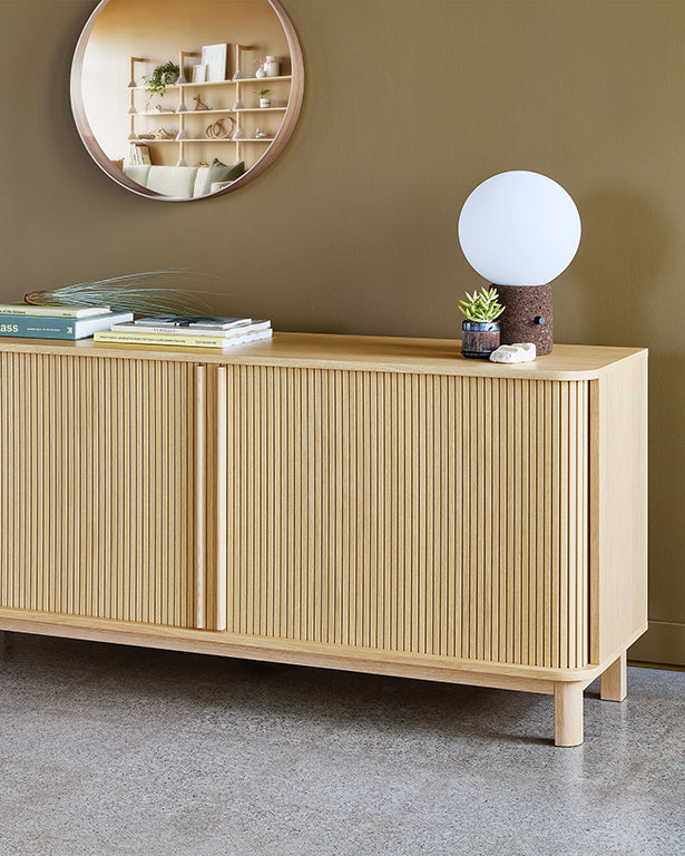 The Ledger Sideboard is crafted with FSC¨-Certified wood and a real wood veneer over a strong engineered core. Tambour doors and solid oak legs add style and functionality. Adjustable shelving, cable management, and a water-resistant finish enhance utility. CARB Phase II compliant and built for long-term durability and environmental responsibility.