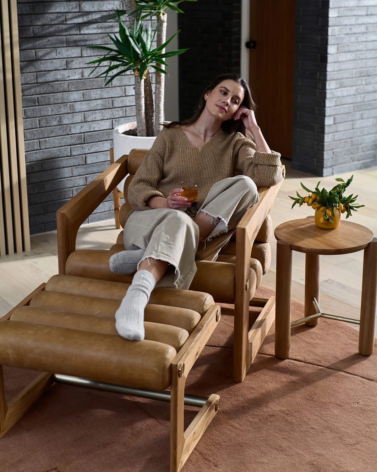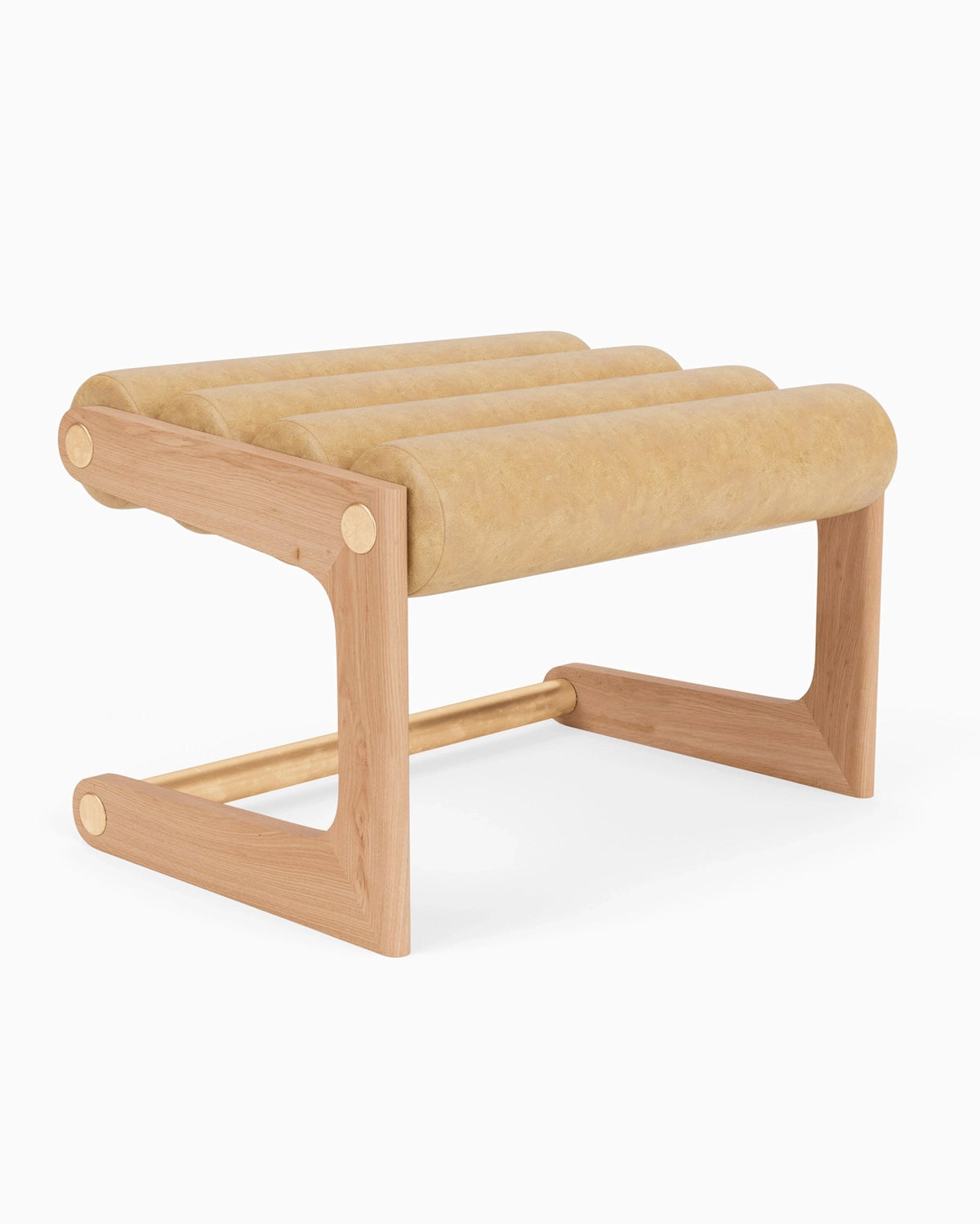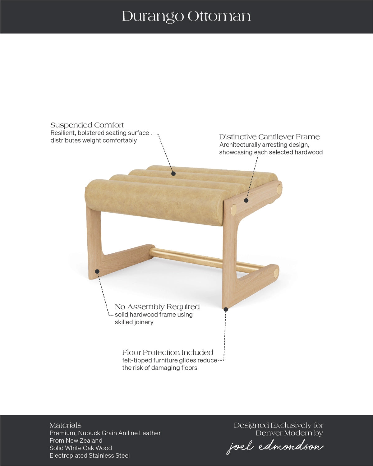 The Durango Ottoman is a study in sculptural balance and refined proportion. Its cantilevered frame, crafted in solid walnut or white oak, highlights the beauty of natural wood grain through clean, architectural lines. A bolstered, sling-style seat with rounded foam offers a gentle give — designed for lasting comfort and subtle visual rhythm.