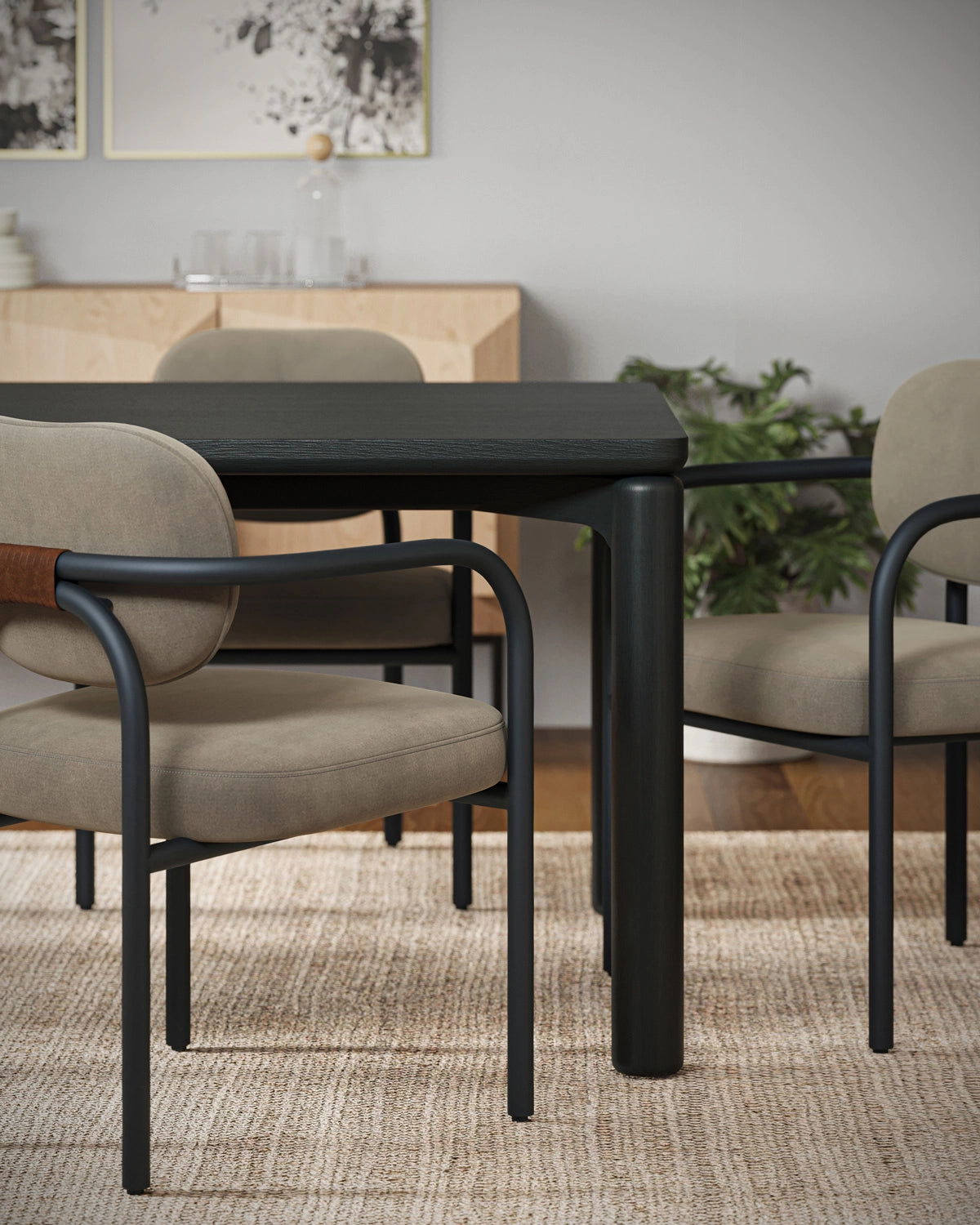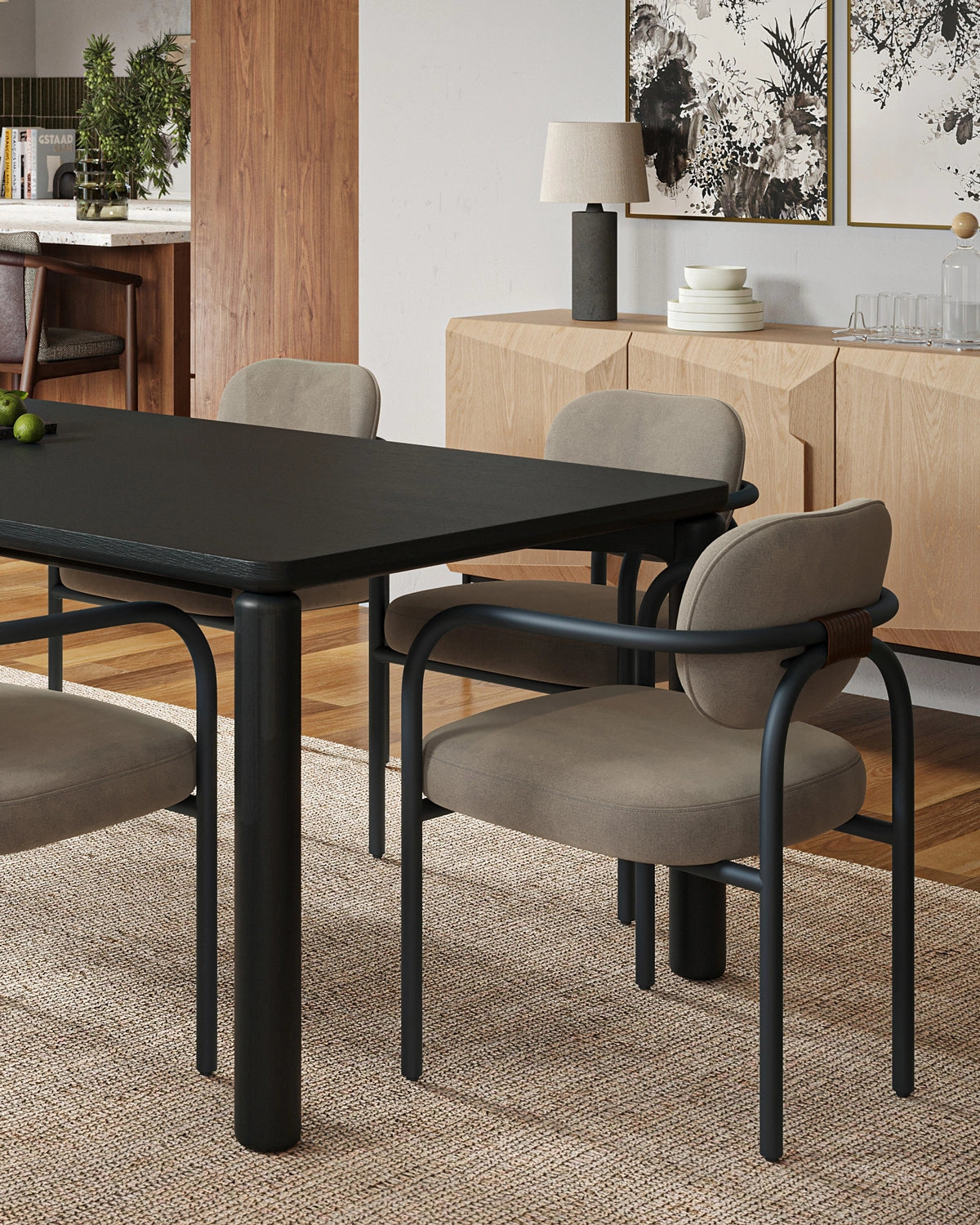 Built on a sleek, matte-black powder-coated steel frame, this mid-century modern dining chair balances structural strength with elegant minimalism. The generous seat and supportive backrest are upholstered in performance-grade velvet or tactile corduroy—delivering a luxury dining seating solution that’s both stain-resistant and easy to maintain. An artisanal hand-wrapped brown leather accent adds a warm, crafted touch that highlights its unique design.