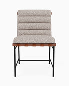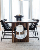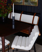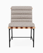 There are several fabrics available for the Vail Dining Chair, including leather and Boucle. The boucle is 100% polyester and is a popular choice for its durability, comfort, and timeless style and our 100% leather is a luxurious and elegant option that adds a touch of sophistication to any room. The Vail Dining collection is supported by a robust black-powder-coated steel frame and features a walnut or white oak dowel accent of your choice, making it an excellent addition to any interior design scheme.