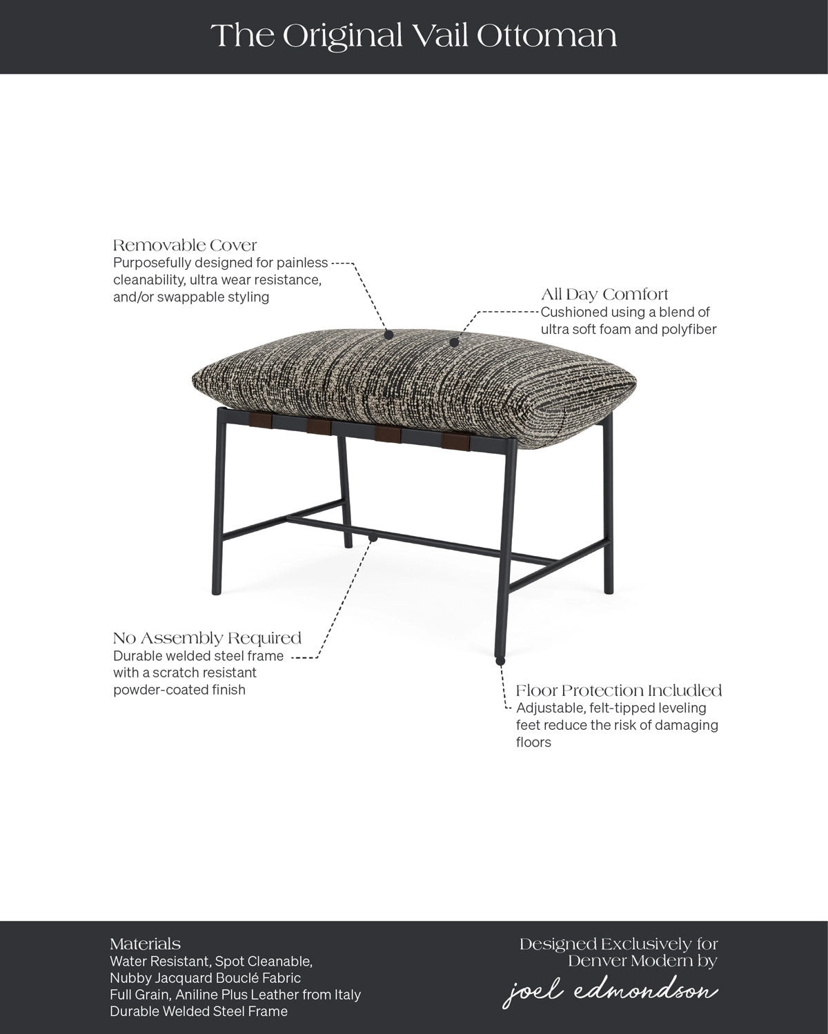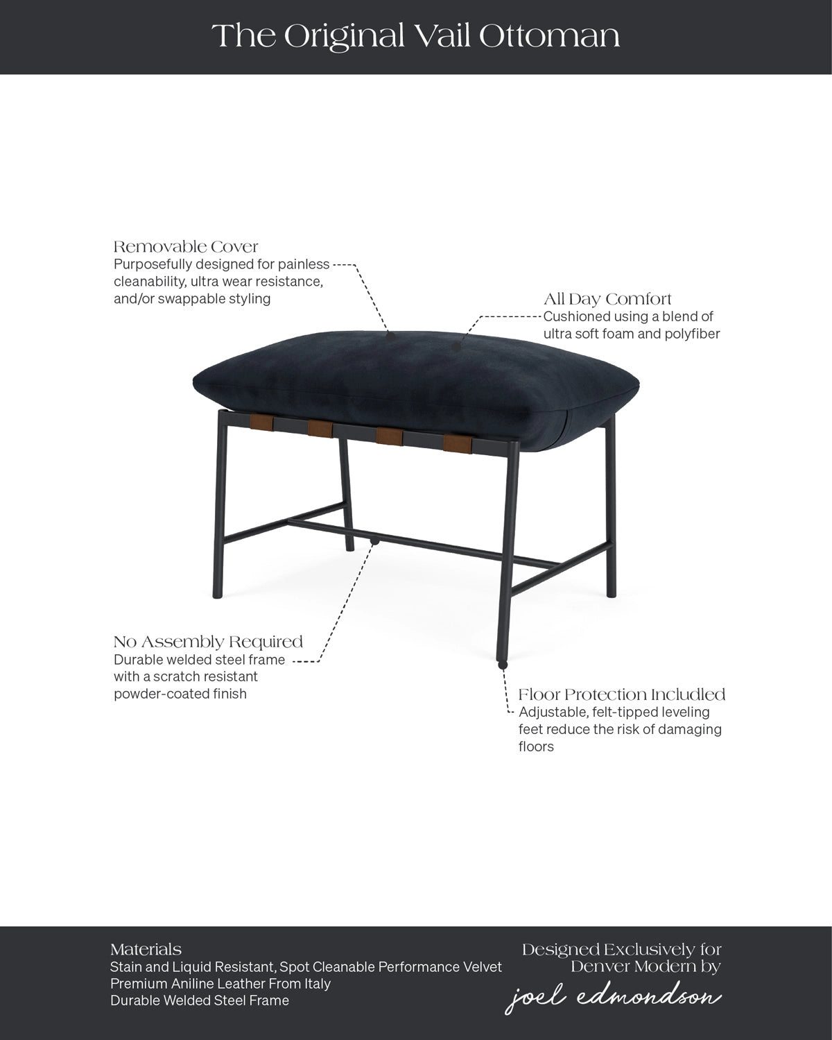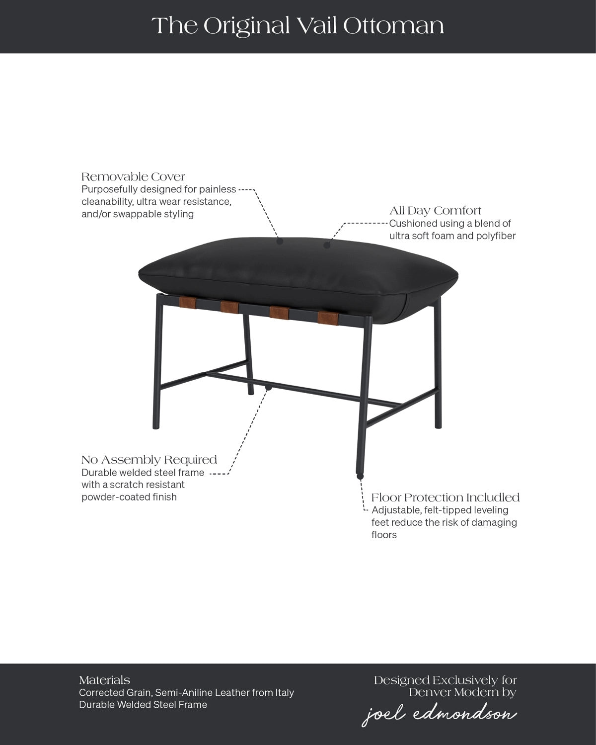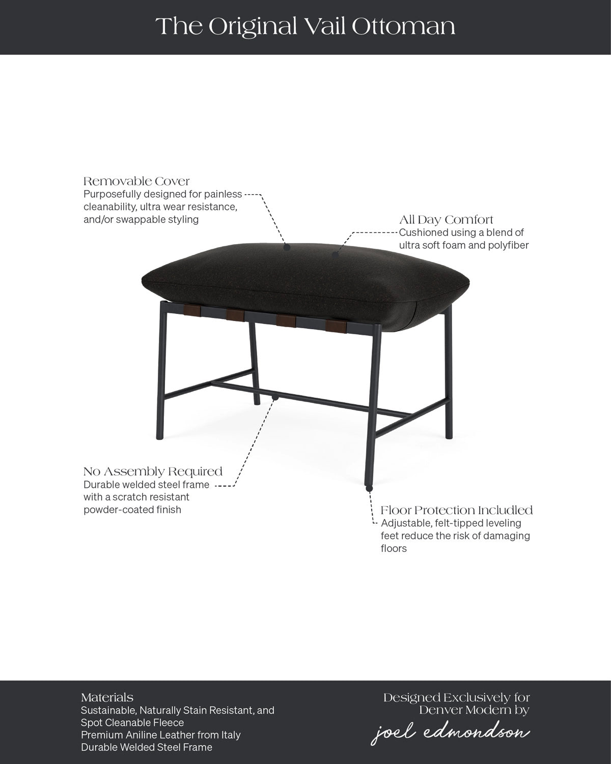 The Vail Ottoman is the perfect companion to our best-selling Vail Lounge Chair, offering comfort, versatility, and signature Denver Modern design. Crafted with the same premium materials, this piece features a sleek black powder-coated steel frame and a plush, cushioned top upholstered in your choice of performance fabrics or artisan leathers.