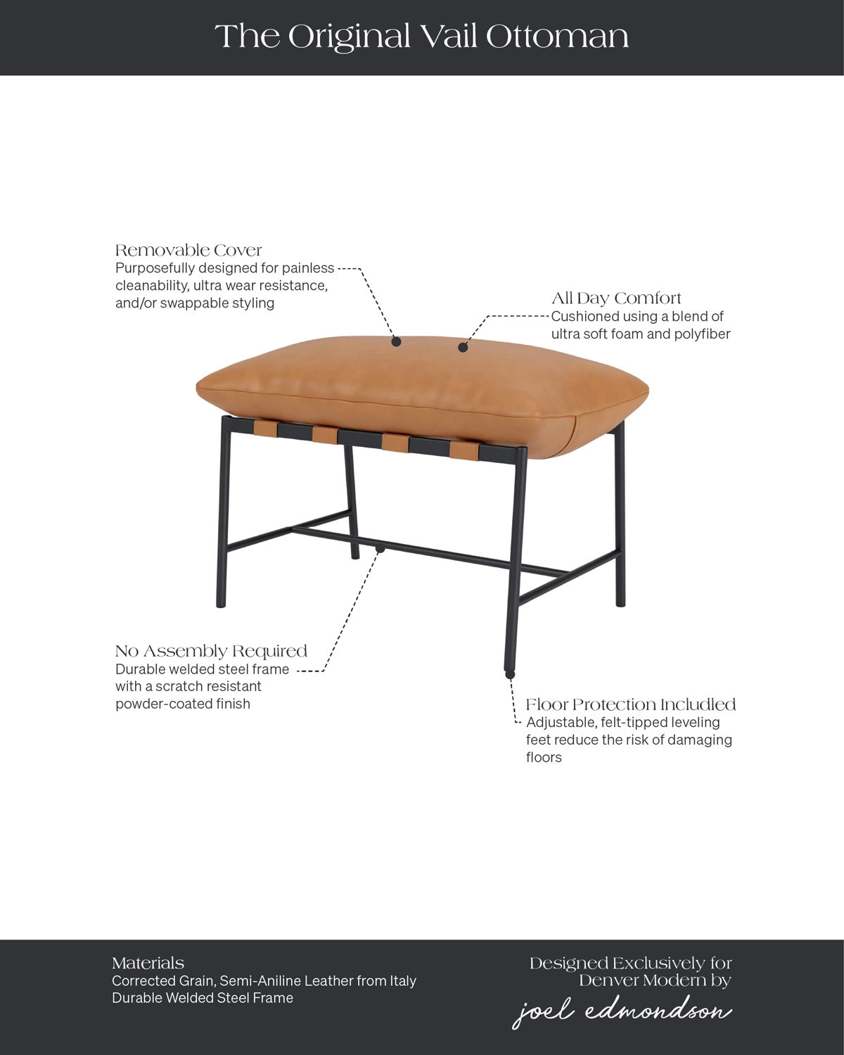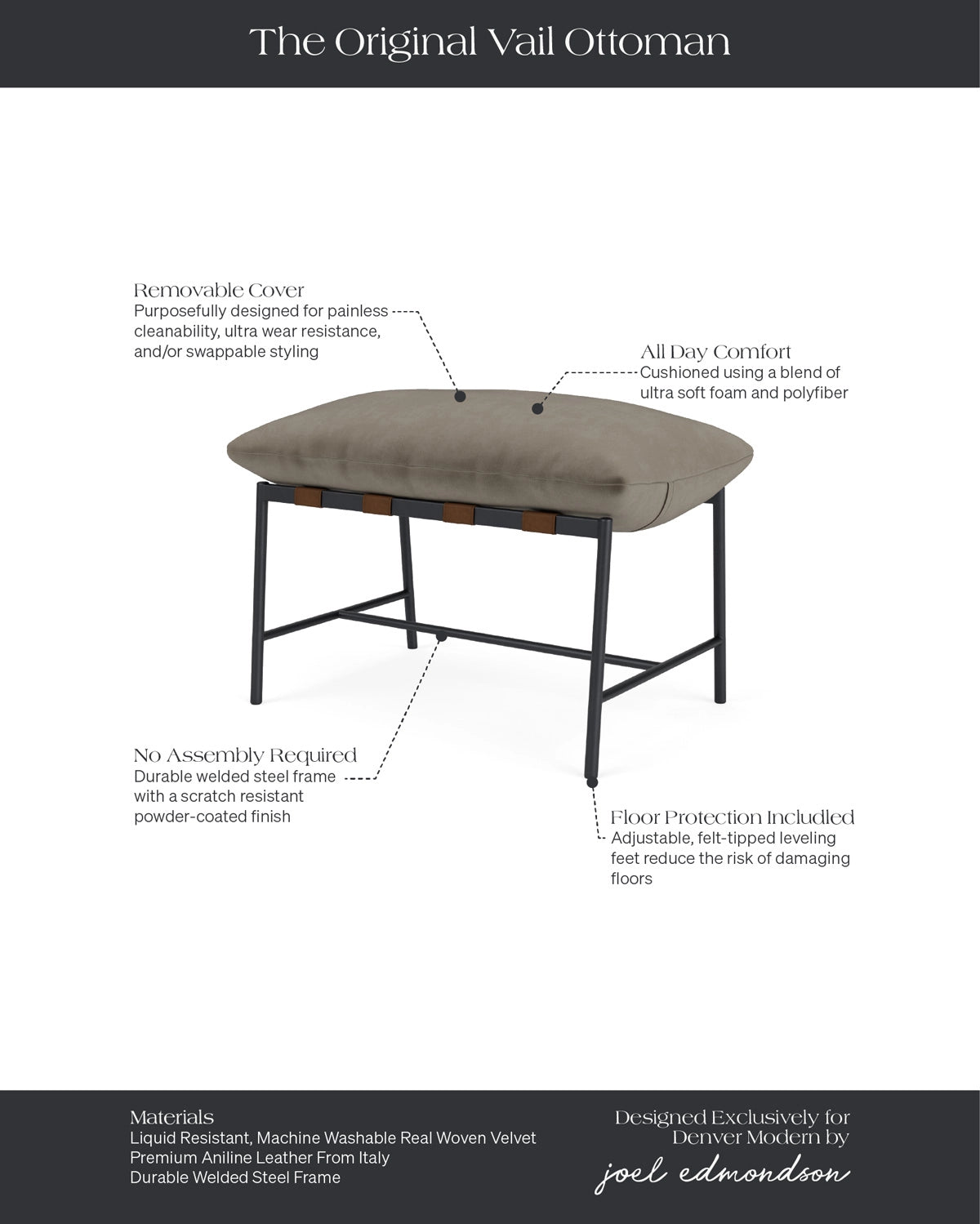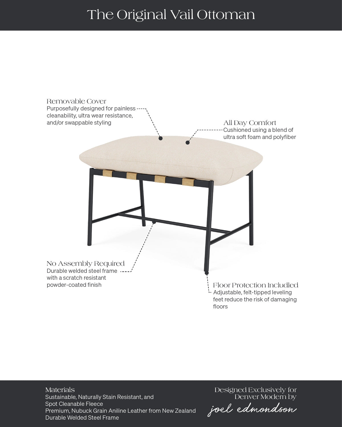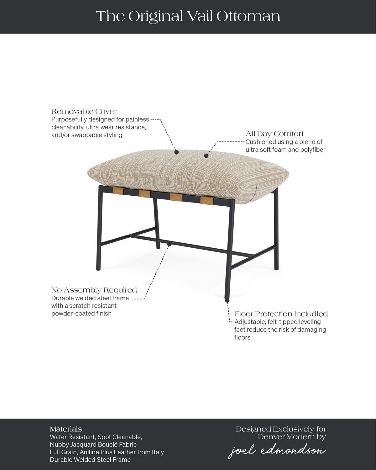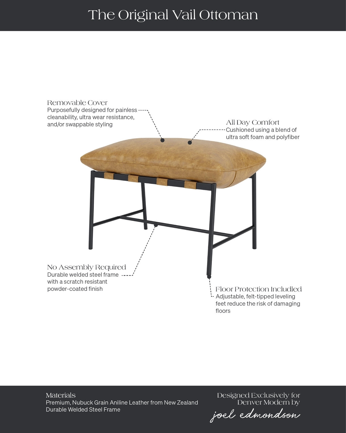 The Vail Ottoman is the perfect companion to our best-selling Vail Lounge Chair, offering comfort, versatility, and signature Denver Modern design. Crafted with the same premium materials, this piece features a sleek black powder-coated steel frame and a plush, cushioned top upholstered in your choice of performance fabrics or artisan leathers.