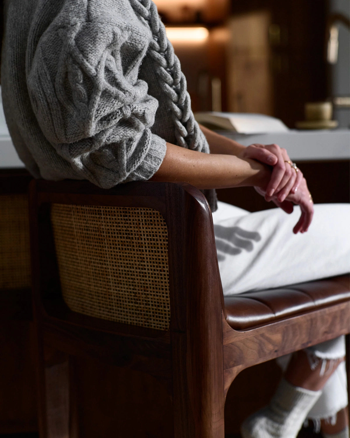 The Canyon Stool translates sculptural sophistication onto its wooden frame with a light and minimalist approach: soft arches and tapered legs merge seamlessly into a channel tufted seat. The elevated material palette blends either white oak or walnut wood with a deliciously soft, premium leather in a similar color - chosen to be monochromatic to emphasize the symbiotic textures of leather and wood. The rattan back of the Canyon Stool enhances these organic textures, making its easy refinement eye-catching from front to back.