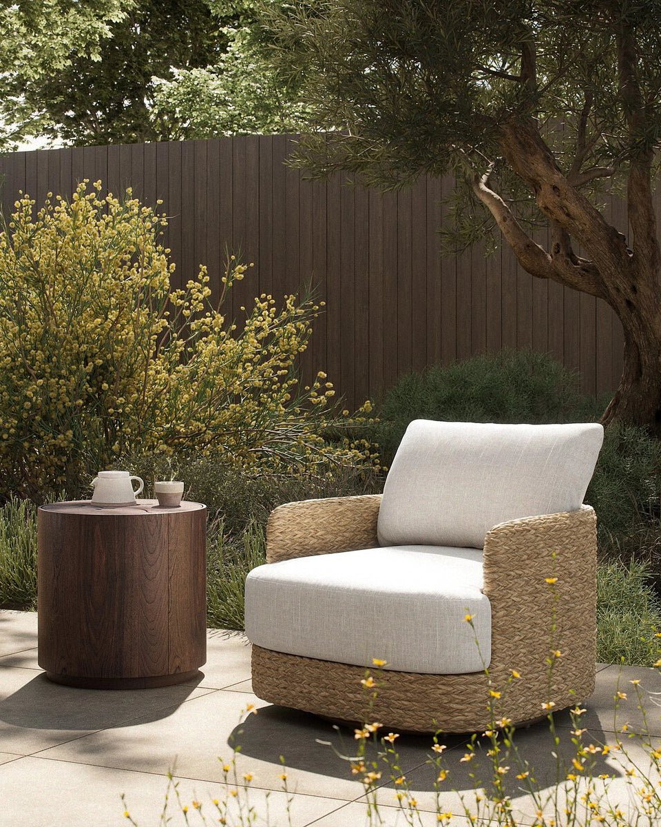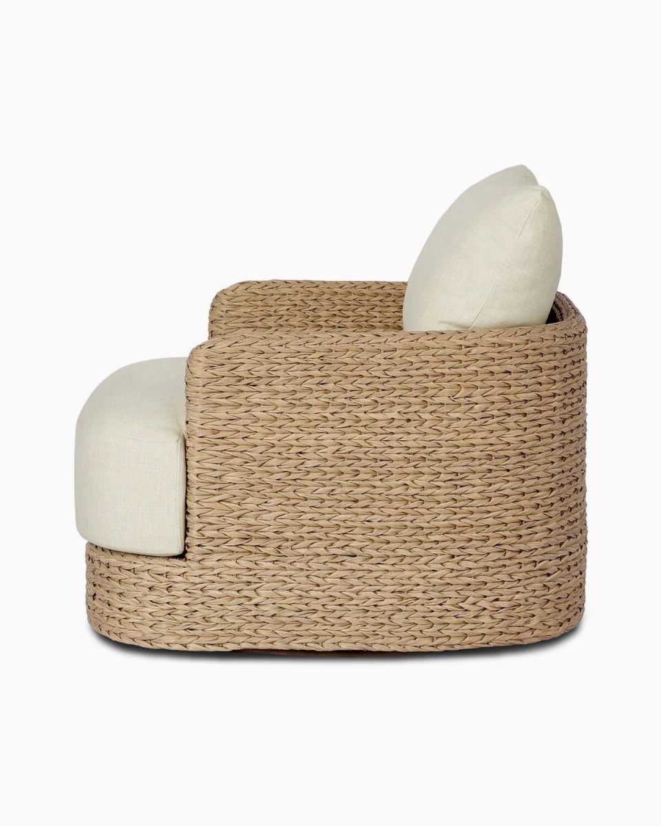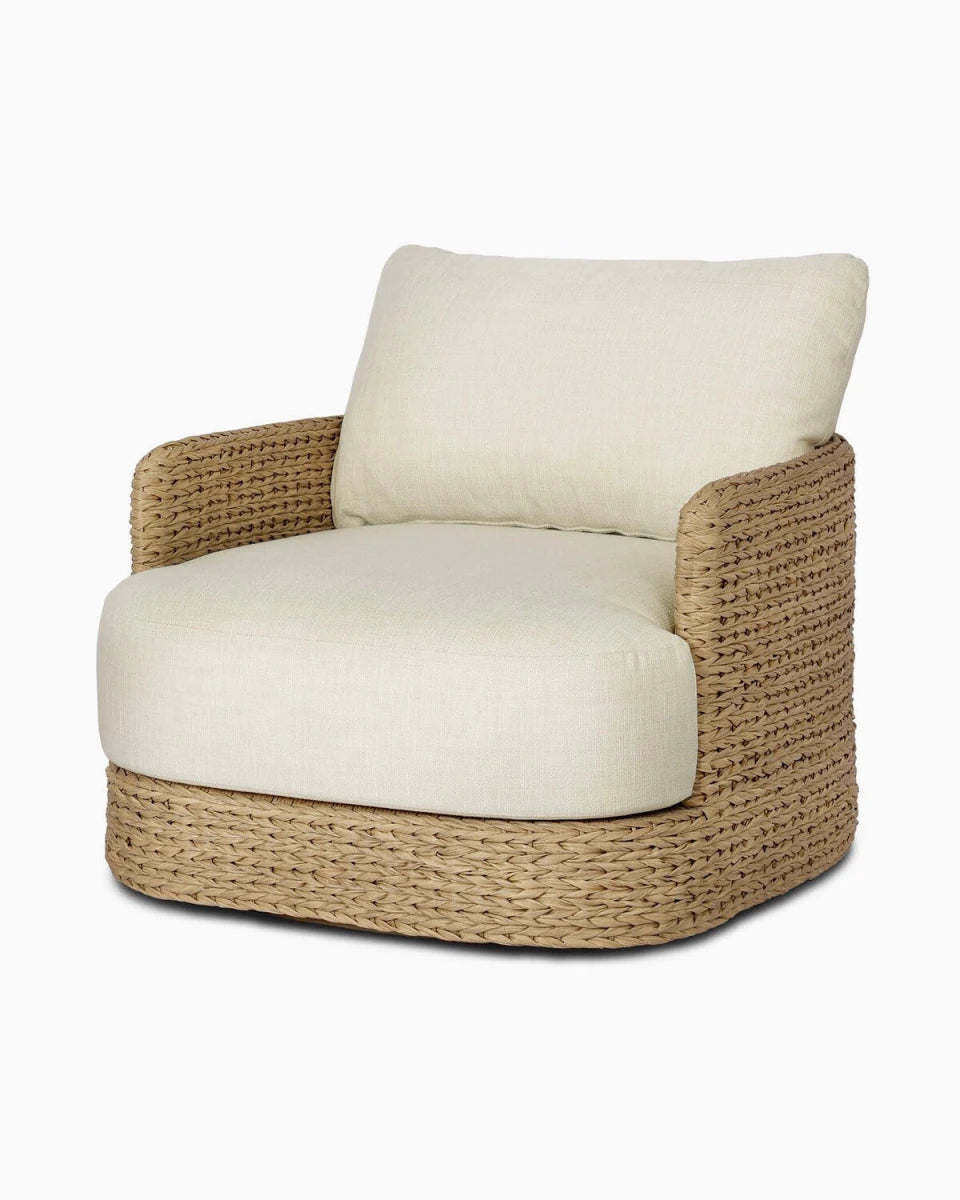 A classic barrel back silhouette meets coastal inspiration with a chunky woven texture. Neutral upholstery and simple shaping make this 360 swivel outdoor chair fit in a number of spaces. Cover or store indoors during inclement weather and when not in use.