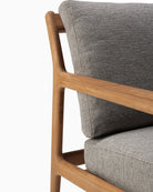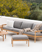 The Jack Outdoor Sofa is made from 100% solid teak, and the cushions are 100% polyprop Fabric and quick-dry-foam.