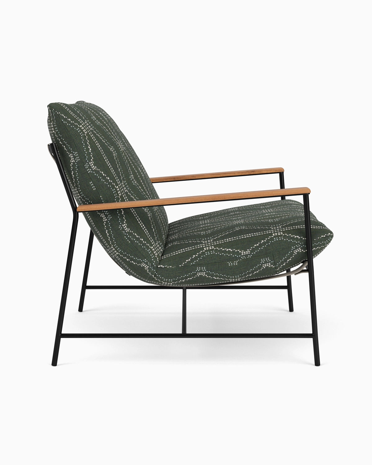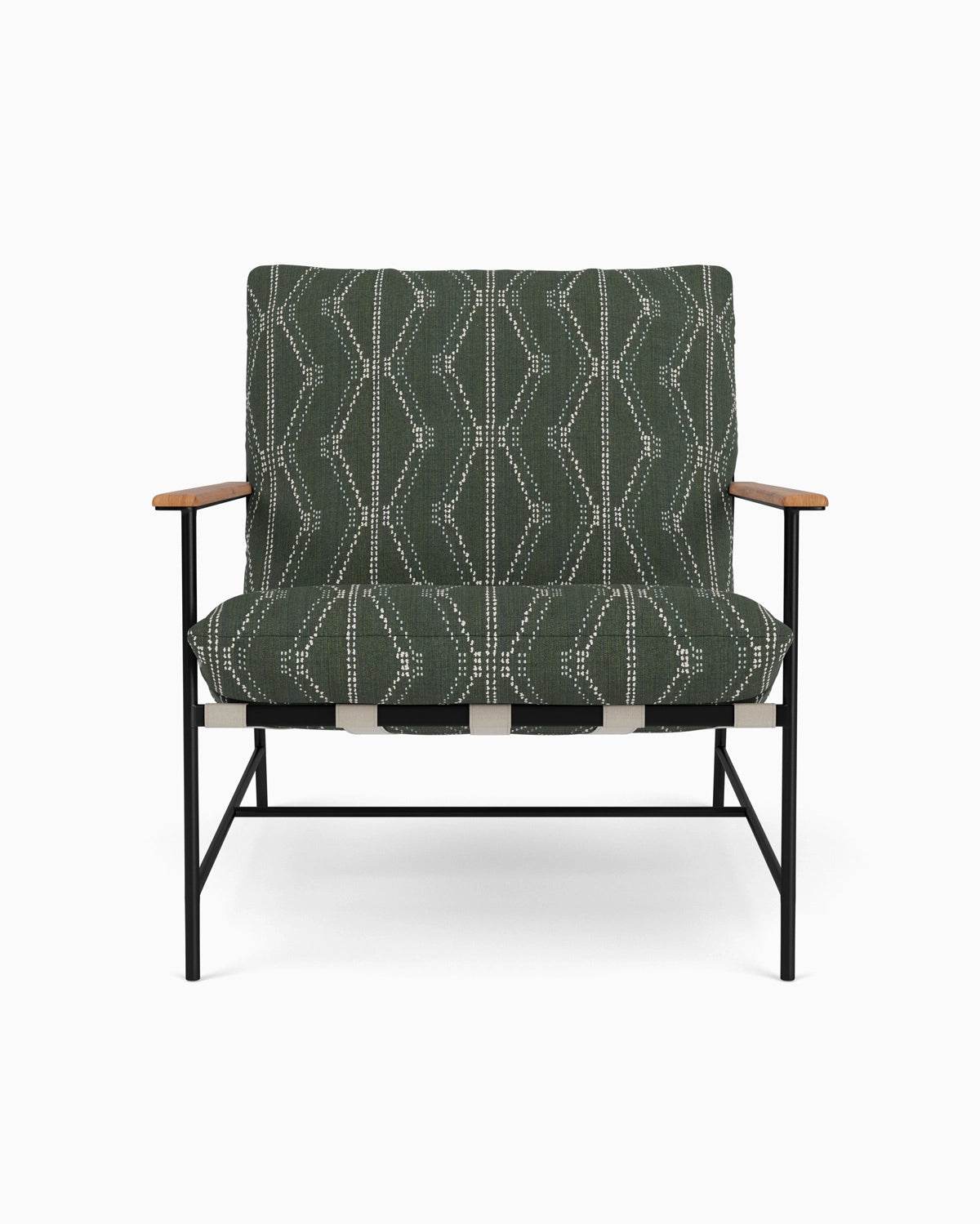 The Outdoor Vail Lounge Chair features durable materials and weather protection, giving homeowners confidence in its longevity and resilience. Designed as a modern outdoor lounge chair, it features a sculptural matte-black powder-coated steel frame, natural teak arm caps, and durable webbing straps selected for strength and longevity. An included all-weather cover helps protect the chair when not in use, extending its beauty across seasons.