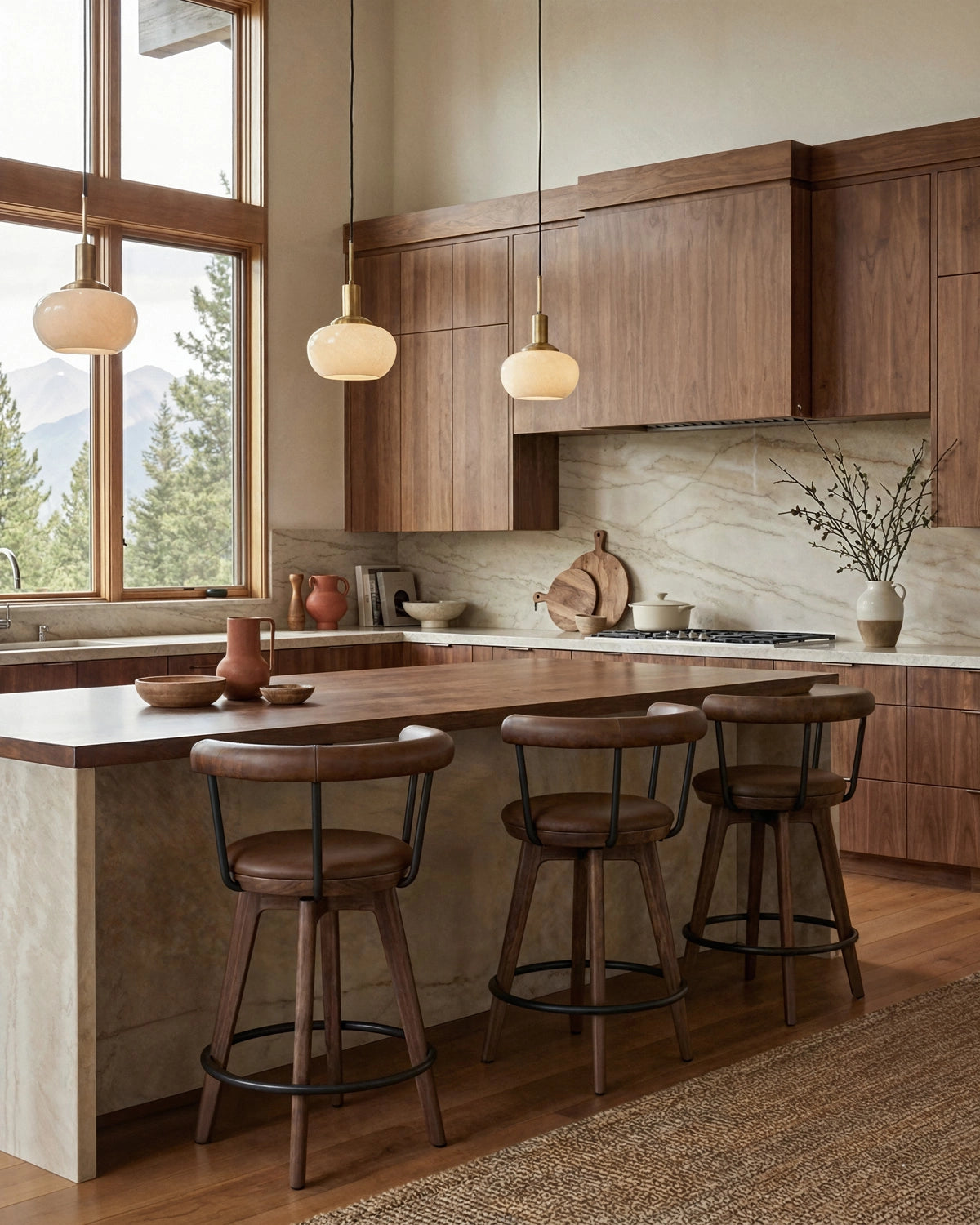 A sculptural, solid-wood frame, available in white oak or walnut, grounds the design with warmth and durability. This thoughtful pairing of materials makes Keystone a standout example of wood and leather counter stools, balancing refined aesthetics with long-lasting performance. The swivel functionality offers modern practicality, enhancing ease of use without sacrificing style.