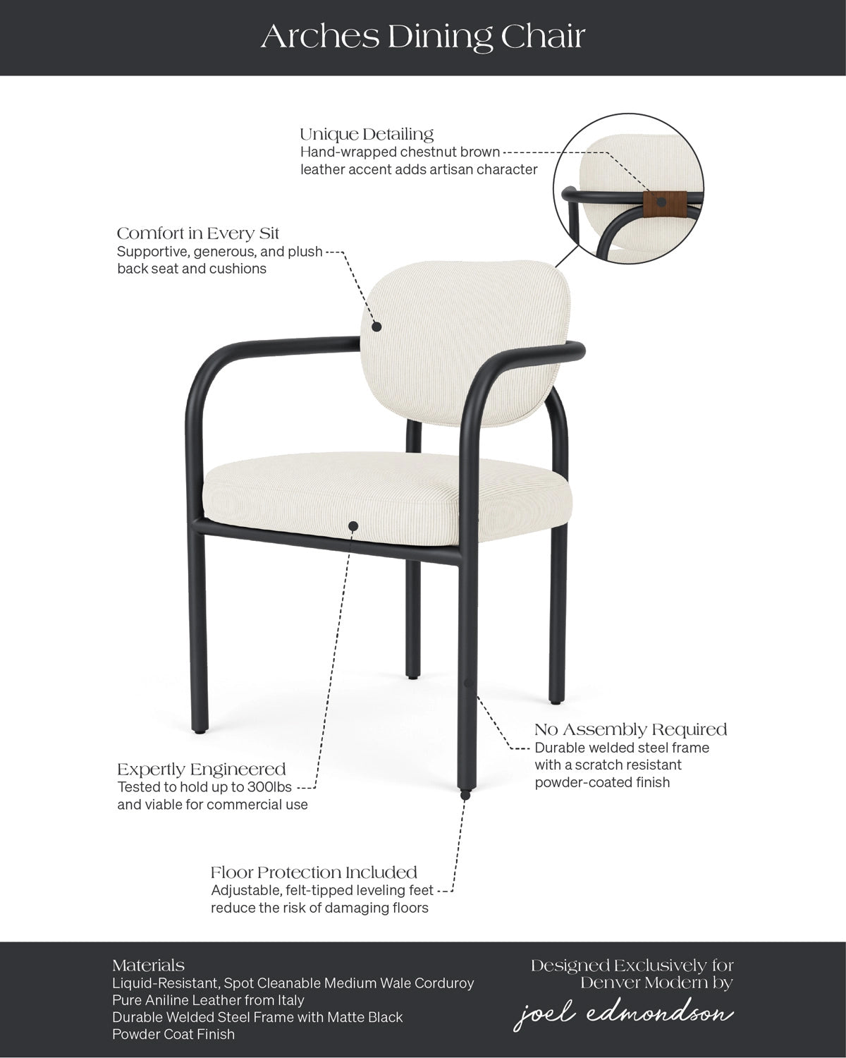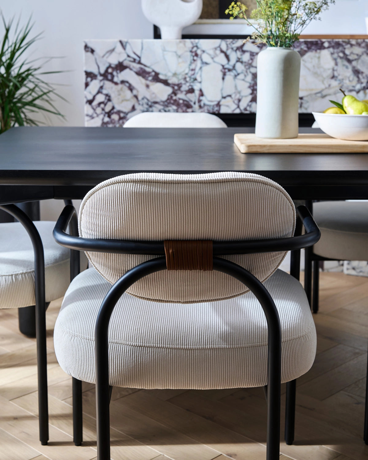 A sleek metal frame, crafted from matte black powder-coated steel, features flowing lines that balance durability and elegance. Its generously cushioned seat and back, wrapped in performance-grade velvet or tactile corduroy, provide the comfort of a lounge with the practicality of stain-resistant, everyday performance. A hand-wrapped brown leather detail adds warmth and sculptural depth, showcasing the chair’s artful craftsmanship.