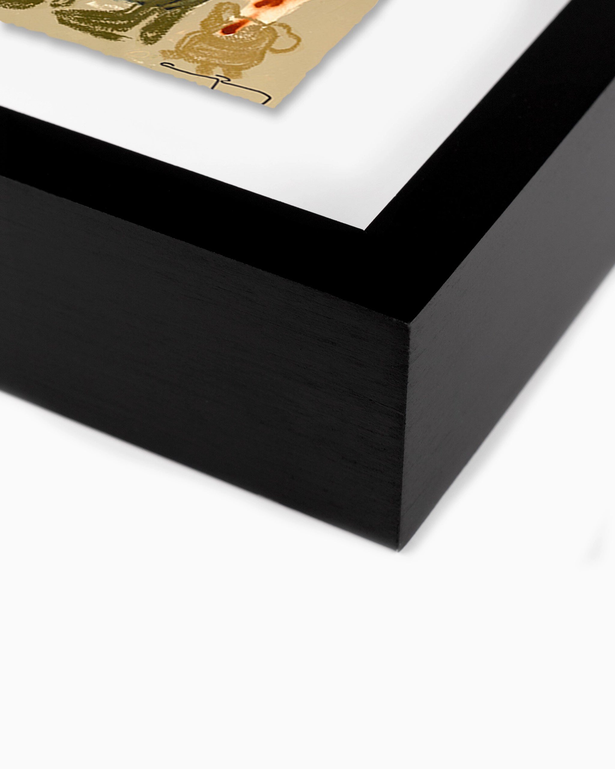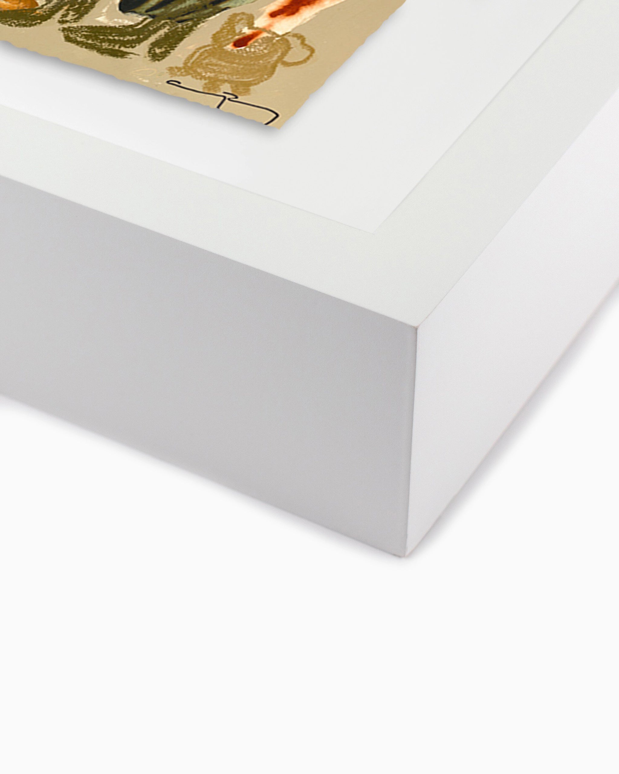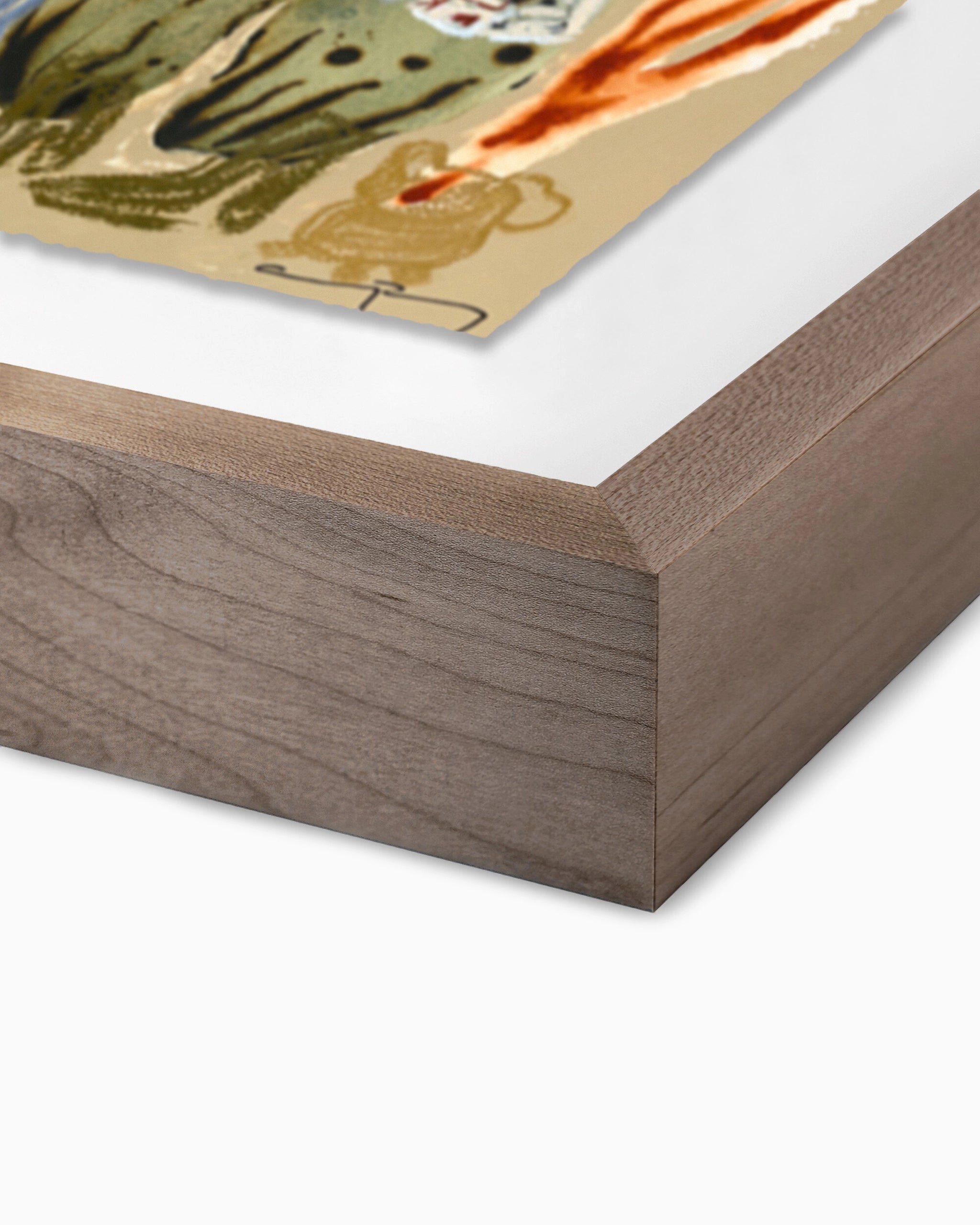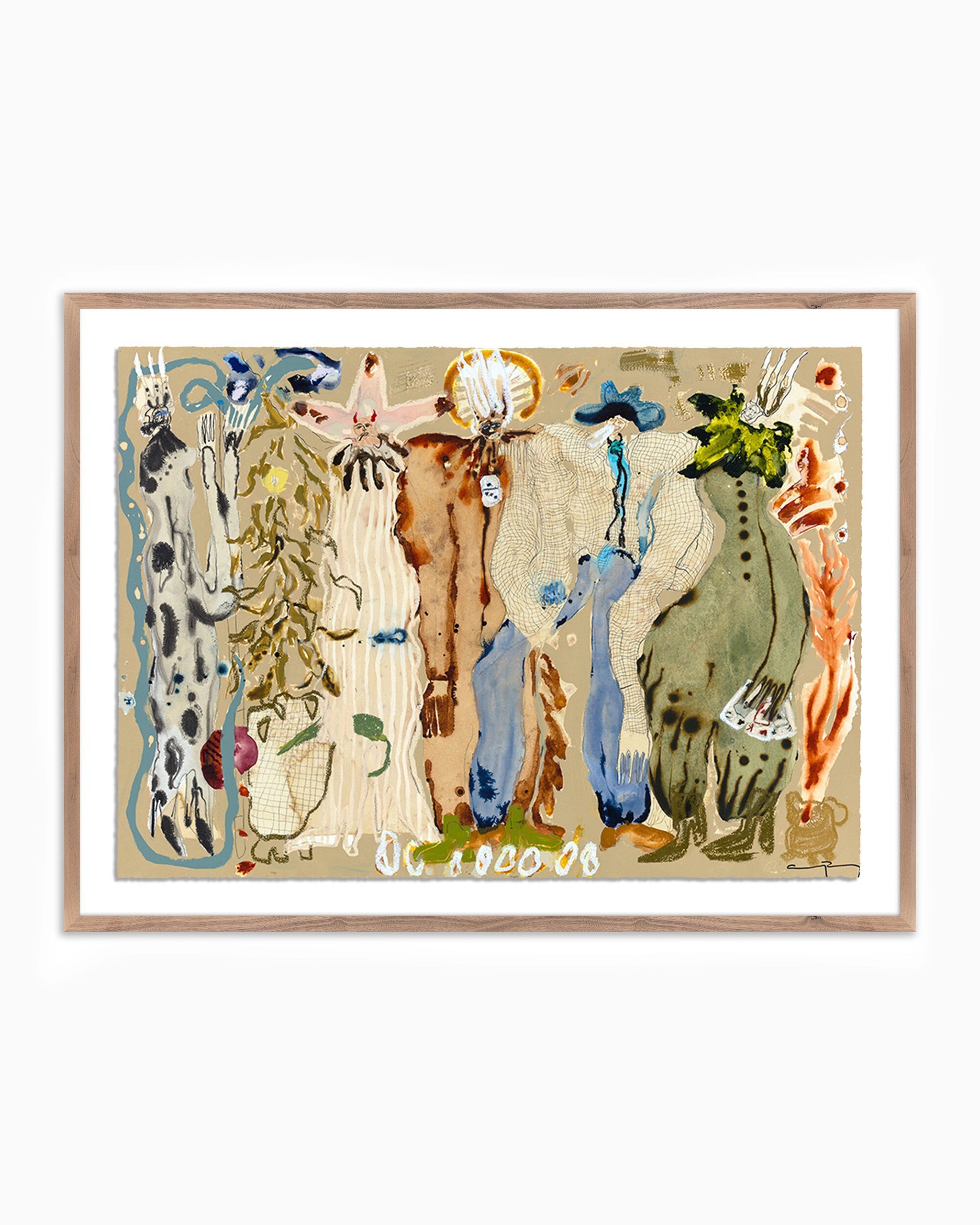 Austin figurative painter Caroline Pinney explores intimacy and human relationships in her art brut-evocative pieces. Working with a range of mediums, from oil stick and charcoal to coffee and spray paint, she often uses her own hand to manipulate materials. Printed on premium paper and float-mounted within a black-finished maple frame. Handmade in Austin, Texas.