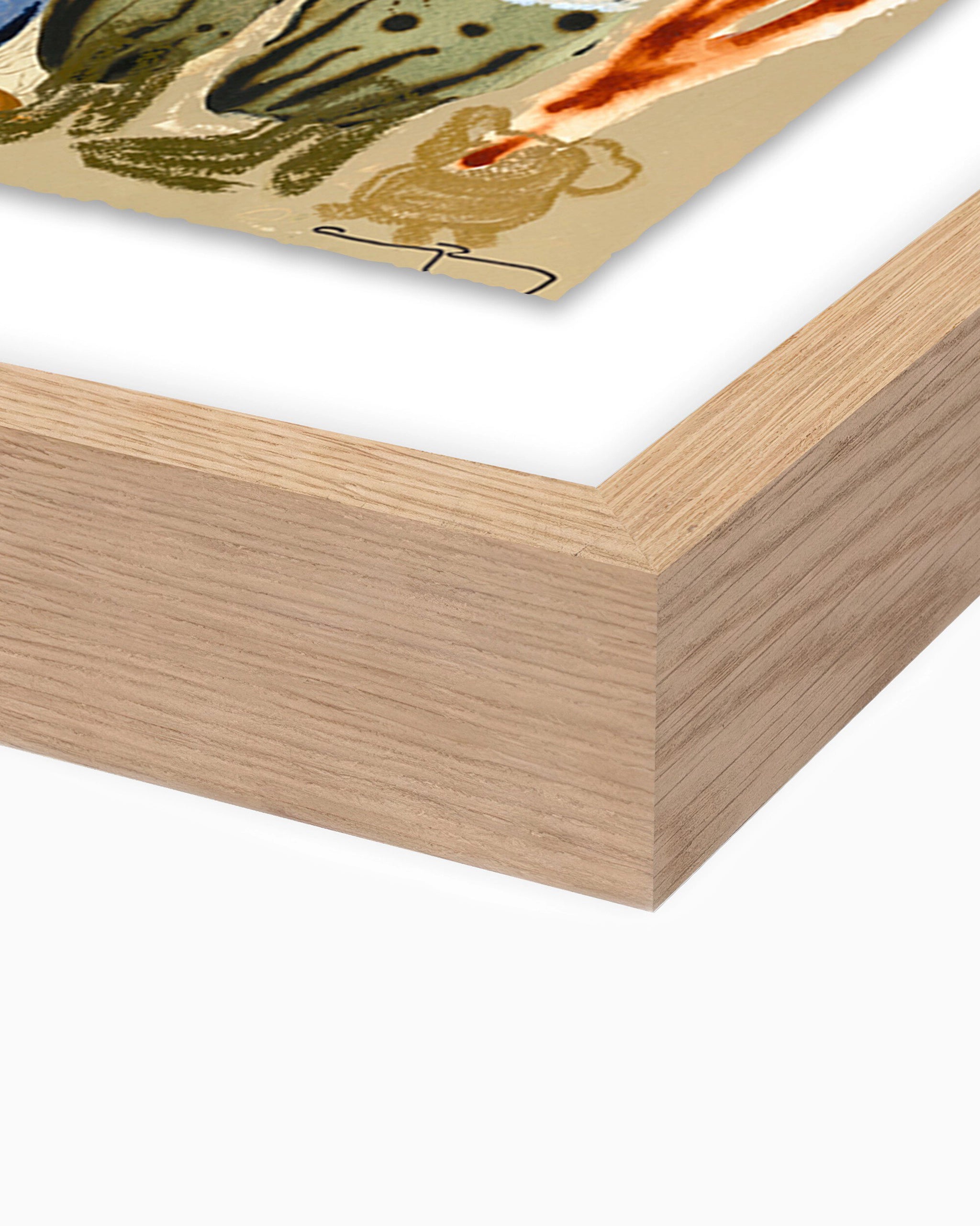 Blue Eyed Snake Woman is framed in solid oak, maple or walnut.