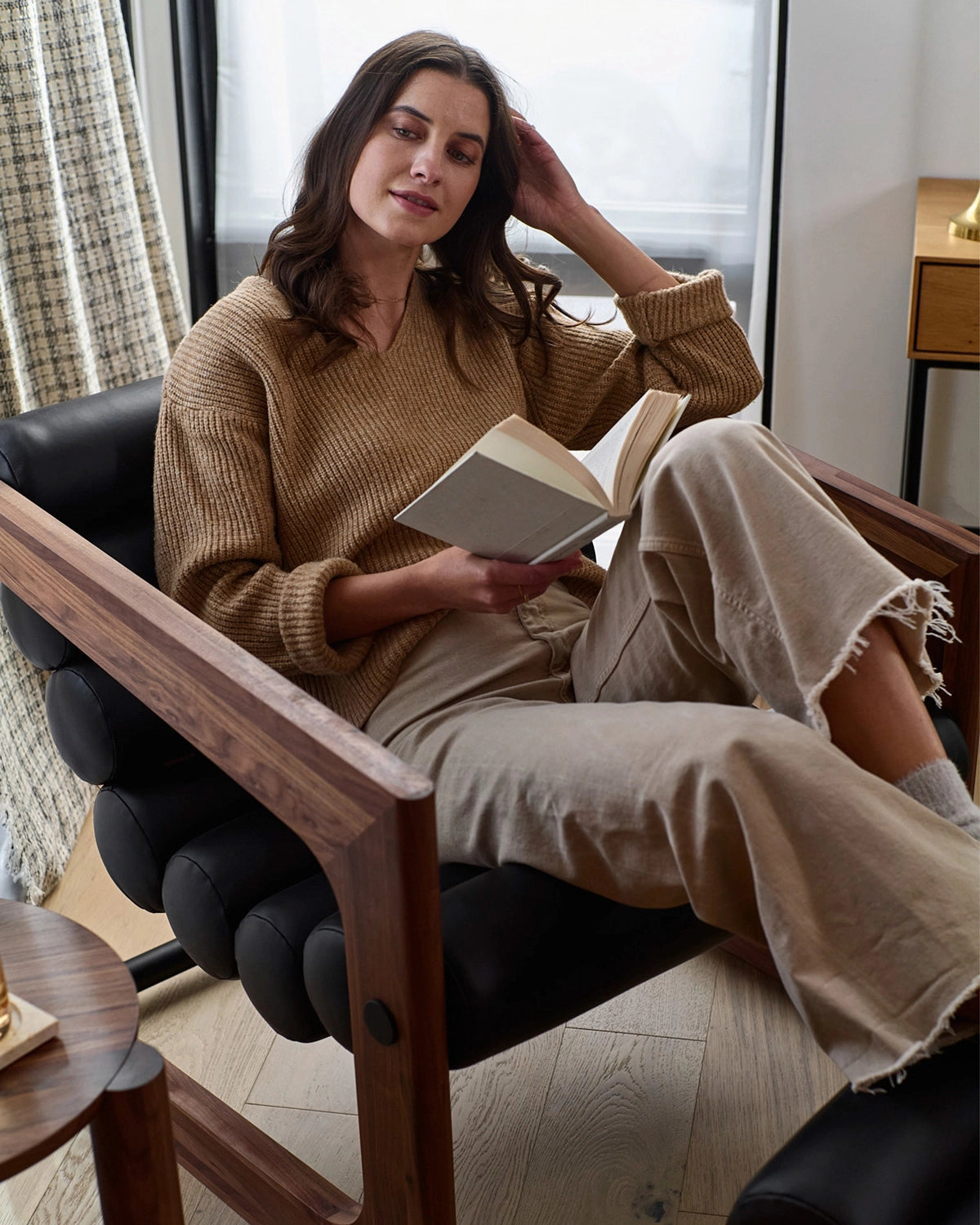 The Durango Lounge Chair is a celebration of proportion, scale, and sculptural form — a statement piece that balances visual weight with effortless comfort. Its cantilevered frame, crafted in your choice of solid walnut or white oak, showcases the beauty of natural wood grain through clean, architectural lines. The bolstered, sling-style seat is gently suspended within the frame, creating a feeling of lightness while offering plush support with rounded foam that yields just the right amount of give.
