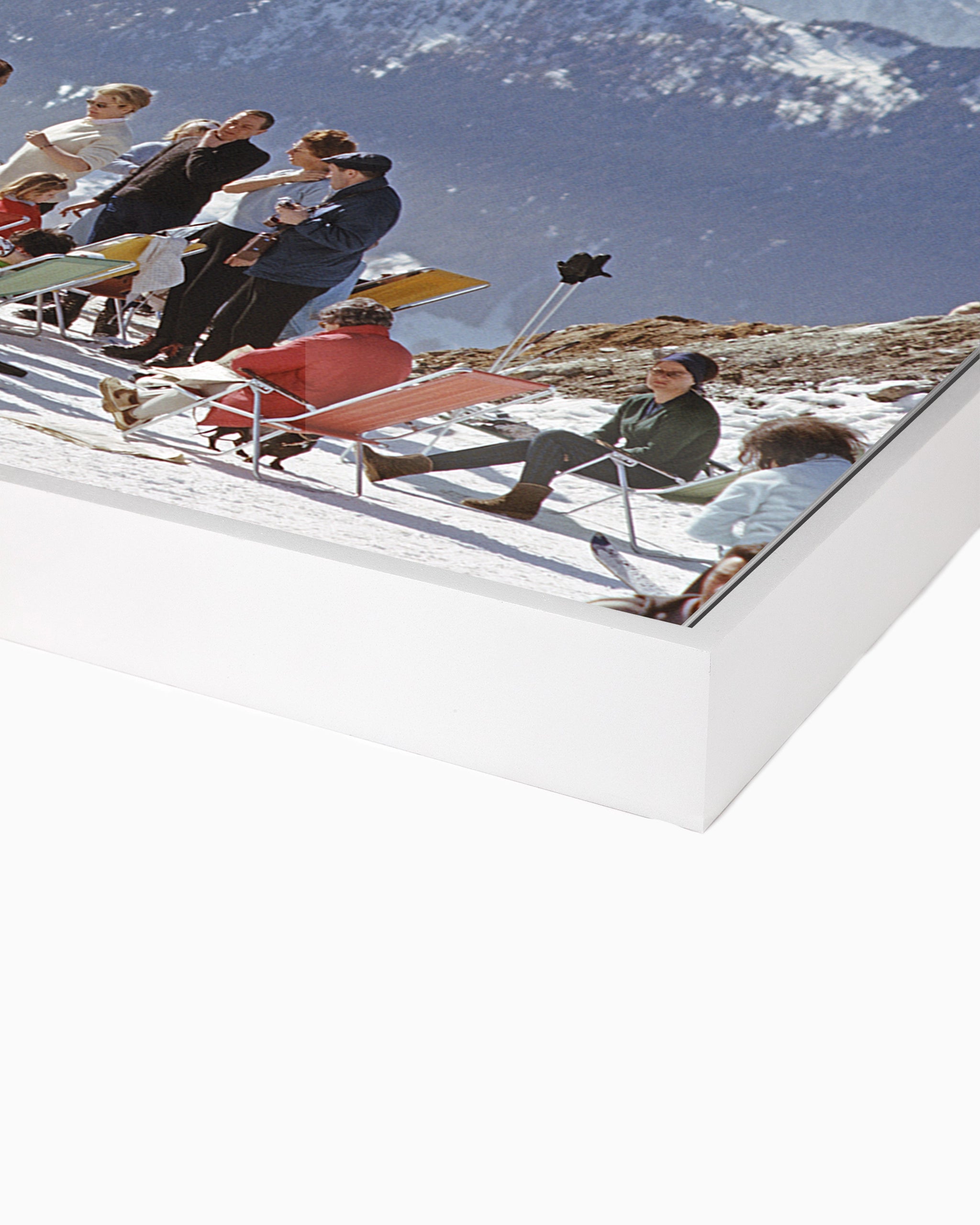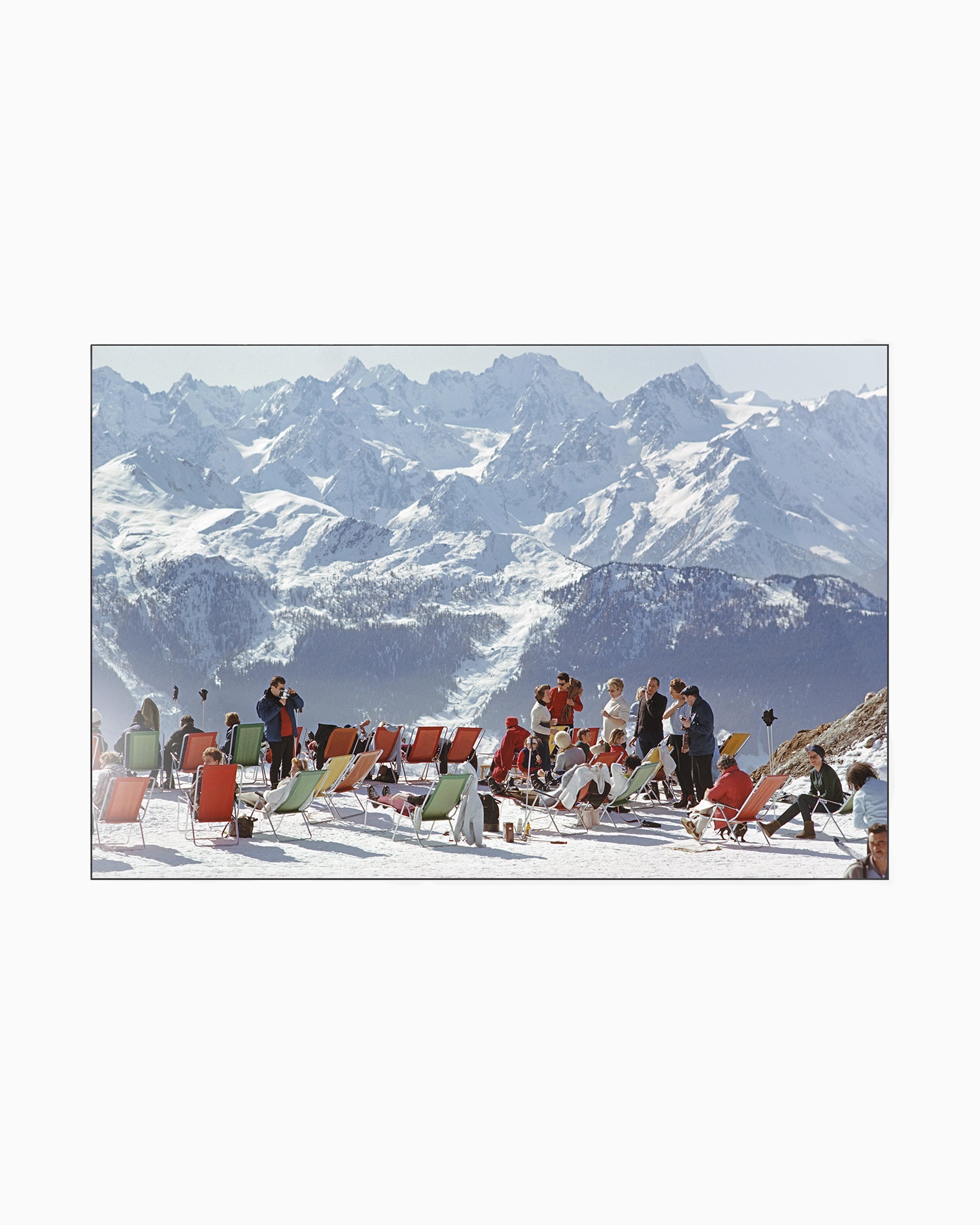 Holidaymakers in sun loungers on the slopes at Verbier, Switzerland, February 1964. This specially selected work from the late influential photographer Slim Aarons is printed using ultra-modern ChromaLuxe technology for the first time ever. High in definition and gloss, images are printed in vibrant, saturated color on fade- and scratch-resistant recycled aluminum. Each is float-mounted with hand-selected framing designed to complement the print.