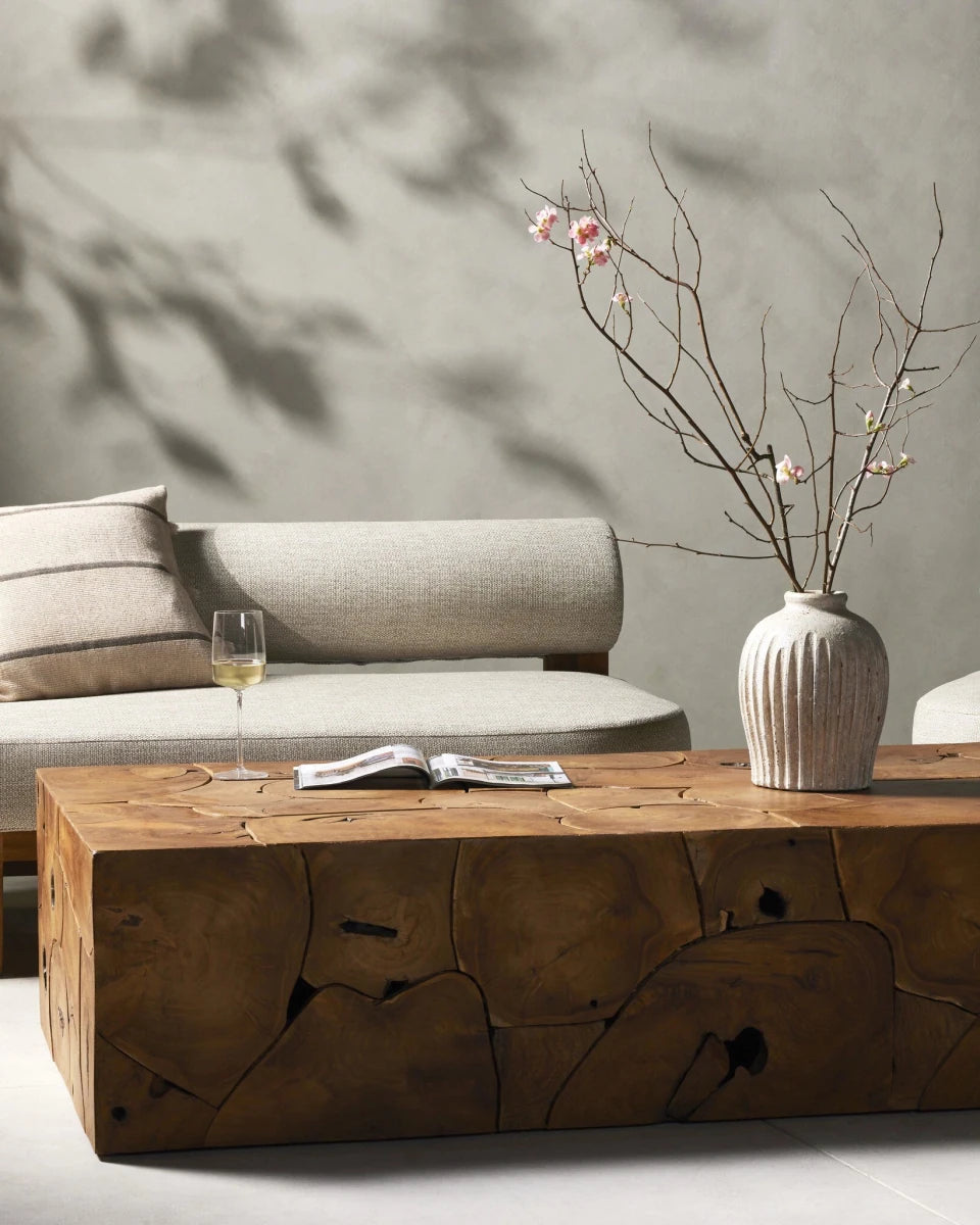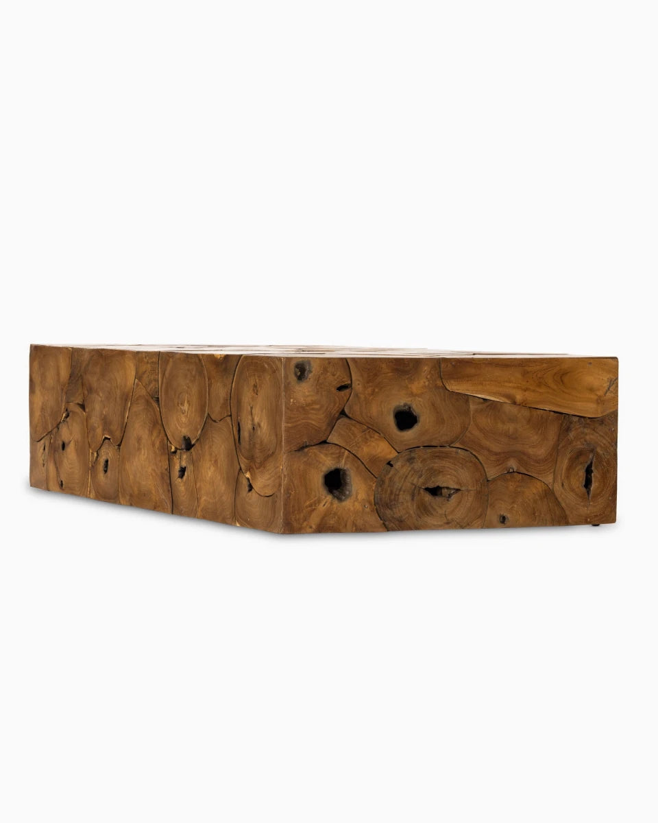 A unique layering piece — indoors or out. Made from laminated teak root with miter joinery, a simply shaped coffee table offers organic vibes and plenty of natural movement. Tables will vary from piece to piece, reflective of natural materials. Joint expansion may grow visible over time. Cover or store indoors during inclement weather and when not in use.