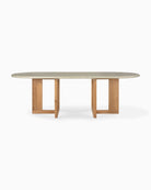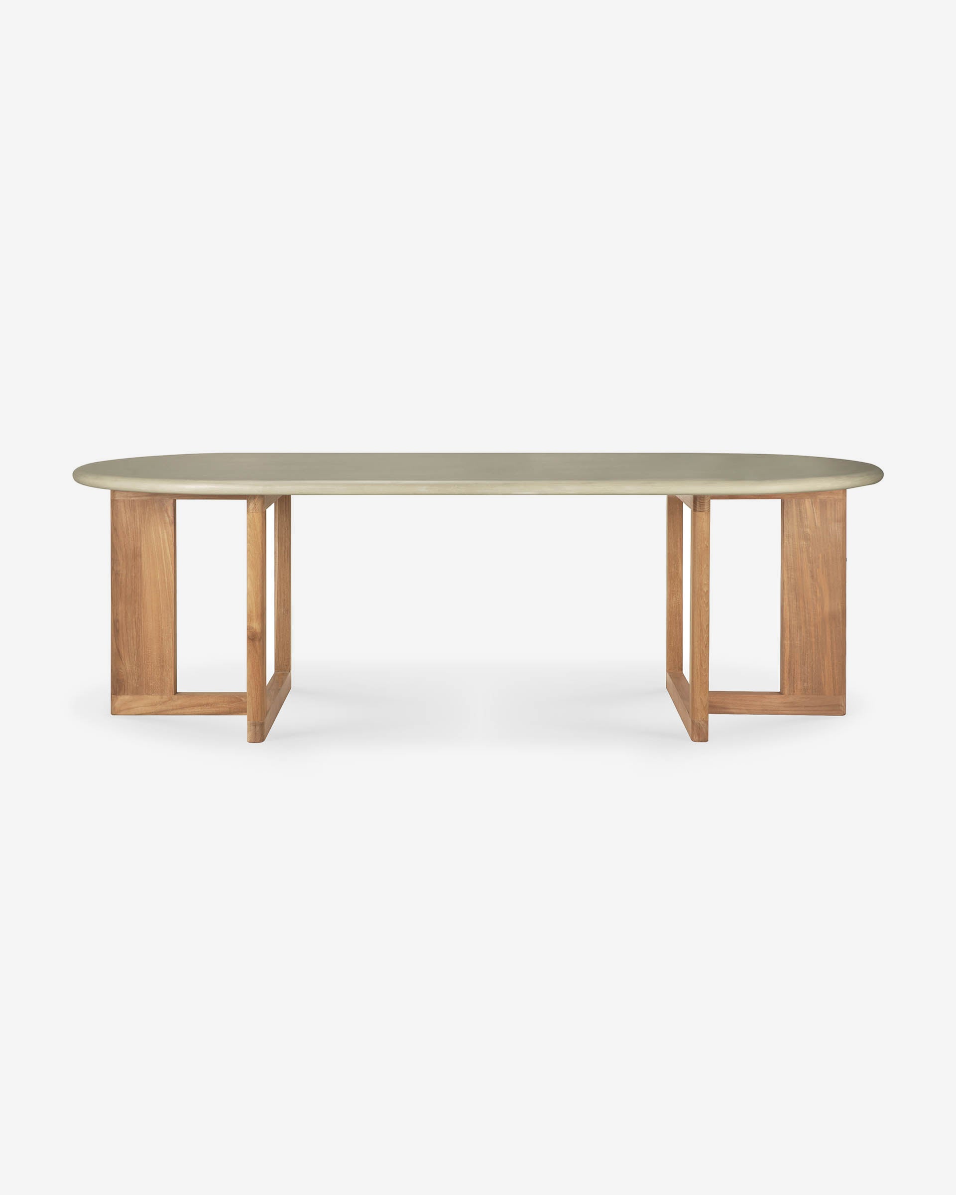 Blending modern sophistication with natural beauty, the Trestle outdoor dining table features a sleek, oblong-shaped concrete top set on a solid reclaimed teak base; both materials known for their strength and resilience against the elements. The wood grain brings warmth and richness, seamlessly working with the concrete to create a harmonious balance. Whether you're hosting a garden party or a cosy indoor dinner, the Trestle promises to be the centrepiece of your gatherings. With two different configuration options, personalise the leg base to suit your preference.